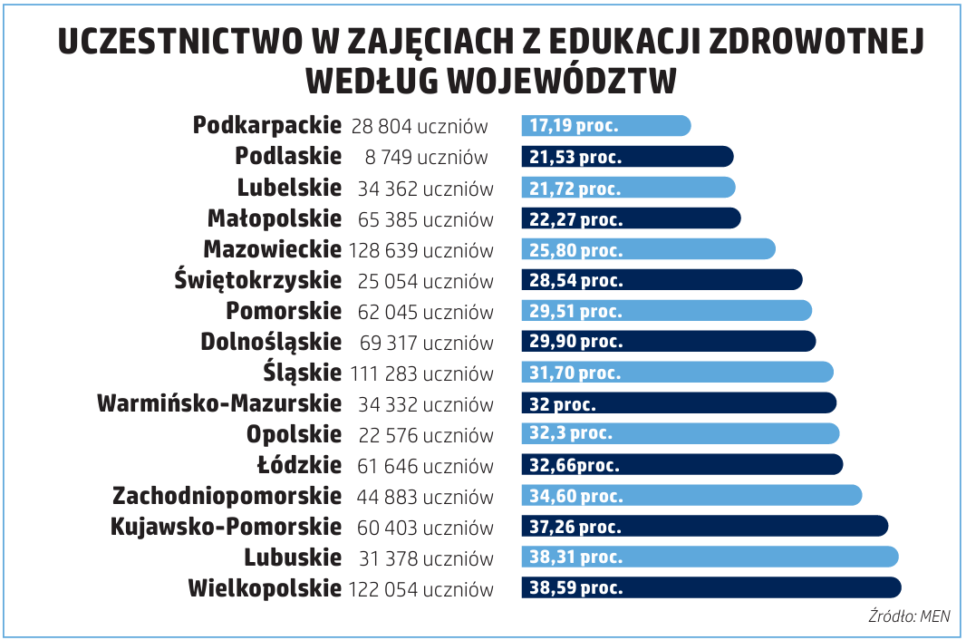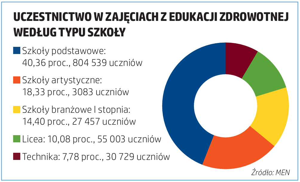 W roku szkolnym 2025/2026 w zajęciach z edukacji zdrowotnej uczestniczy 920 925 uczniów, czyli około 30 proc. wszystkich uprawnionych. Dane z prawie 100 proc. szkół pokazują, że najwięcej uczęszczających jest w szkołach podstawowych – 804 539 uczniów (40,36 proc. uprawnionych), w liceach ogólnokształcących jest ich 55 003 (10,08 proc.), w technikach 30 729 (7,78 proc.), w branżowych szkołach I stopnia 27 457 (14,40 proc.), a w szkołach artystycznych 3083 (18,33 proc.).